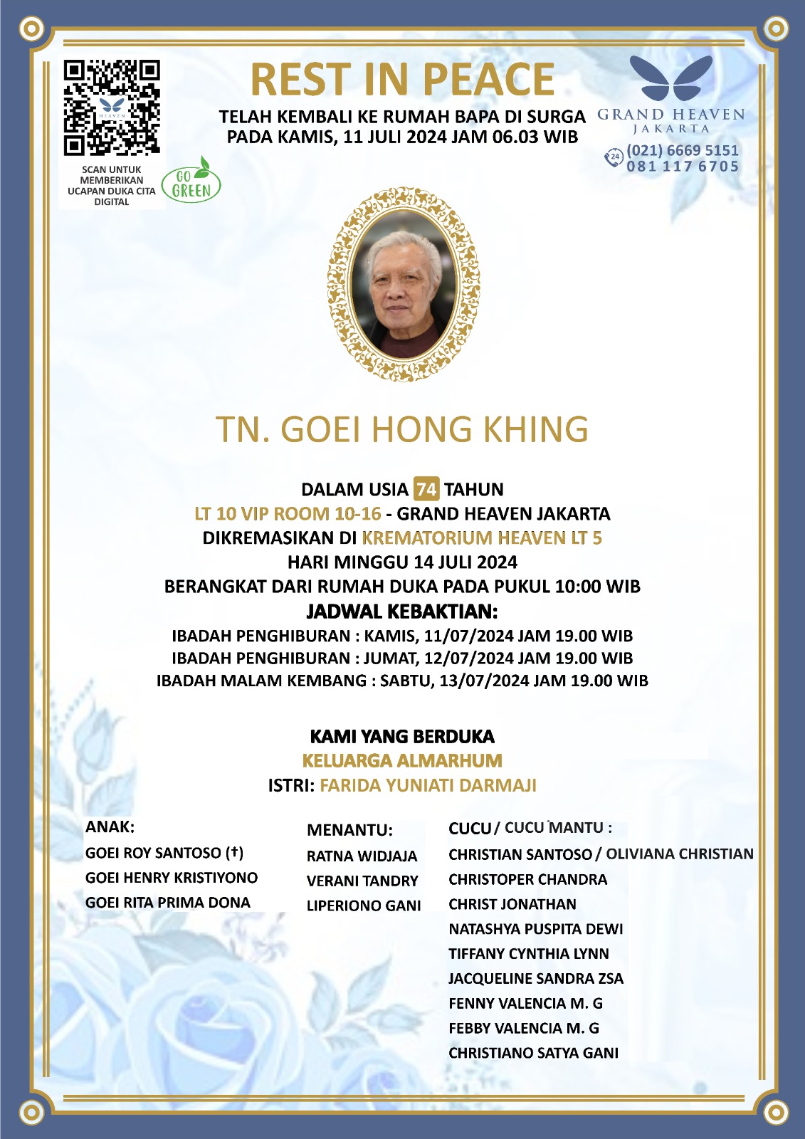 Dan informasi yang diberikan ibadah penghiburan Kamis 11 juli 2024 dan Jumat 12 juli 2024malam jam 19.00 Wib. Ibadah malam Kembang Sabtu Malam 13 juli 2024 jam 19.00 wib. Minggu 14 juli 2024 di kremasi di grand heaven lt 5 berangkat dari ruang duka jam 10.00 Wib.